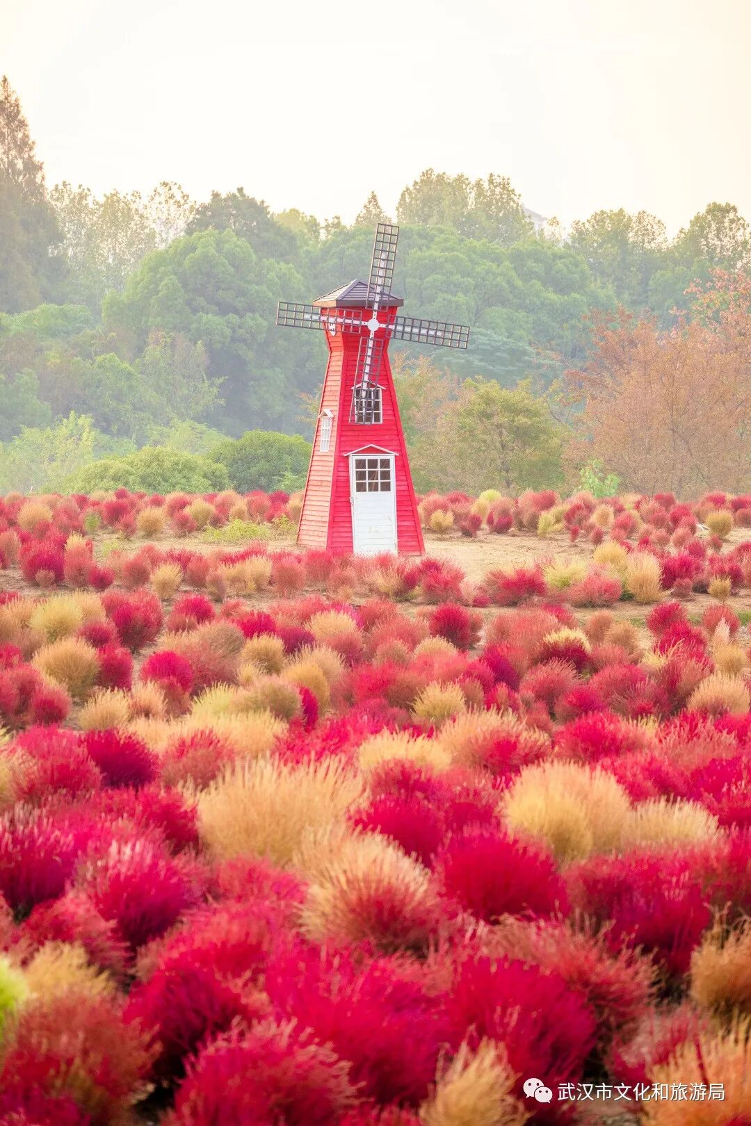 而桂花则是秋天当仁不让的信号。10月18日,武汉人翕动着鼻孔,奔走相告:一夜秋风过,满城桂花香!比起嗅闻,@杨爽blue 更爱记录下桂花的模样。她拍摄了家楼下、昙华林、磨山的桂花,印象最深是磨山,那里的桂花品种多、面积大,整个人直接泡进桂花甜香里。○10月,「汉阳汉江湾」桥下的空地上,30000平方米的百日菊花海迎风绽放「马鞍山森林公园」的向日葵,今年花海扩大了10倍,更加壮观。@春情阿茶 和朋友去时,琢磨要怎么拍出不一样的风景,正好碰见工作人员给向日葵“洗澡”,定格,咔嚓,向日葵出浴图,美丽!○11月1日,「沙湖公园」菊展撞上园艺展,百日菊花海找角度拍大片 摄影/春情阿茶10月下旬,@TIANCHUNYU 为了拍到「马鞍山森林公园」地肤草最美的样子,起了个大早,在6点半前就抵达了。秋天的日出前后,光不会很耀眼,地肤草像被打了柔光滤镜,好看。○「马鞍山森林公园」地肤草 摄影/TIANCHUNYU