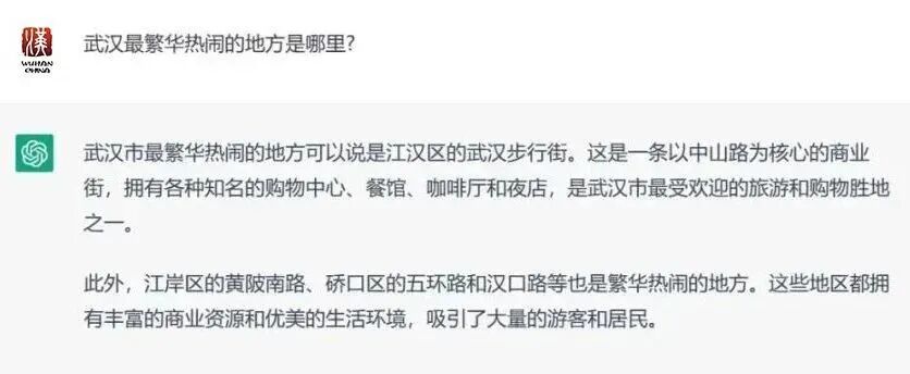武汉好大,要问「武汉市中心在哪儿」或者「武汉最热闹的地方在哪儿」,得到的答案肯定五花八门。ChatGPT会怎么回答呢?