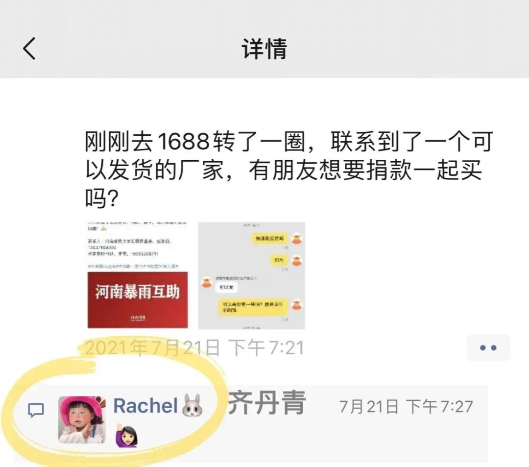研究生处的老师朱莉在看到有关募捐的朋友圈后,二话不说向齐丹青私信捐款,她说:“看到齐同学正在组织募捐,觉得终于可以实实在在地帮点忙了!不只是把对河南同胞的关心挂在嘴边,我心里很高兴也很感动。”