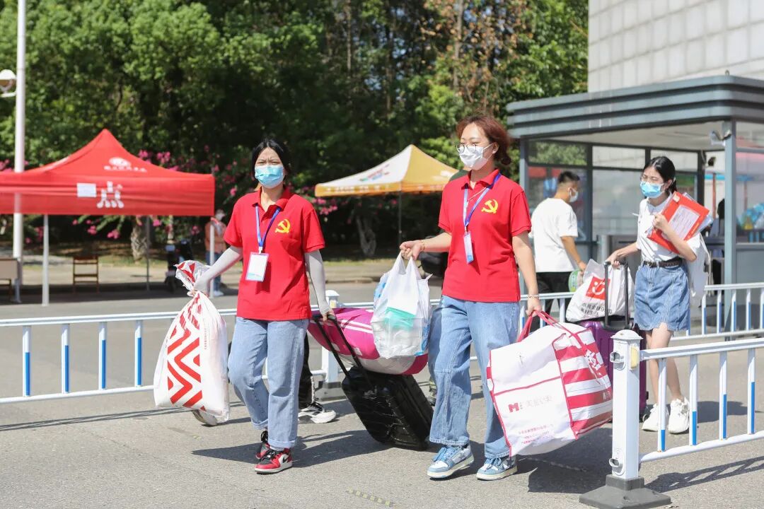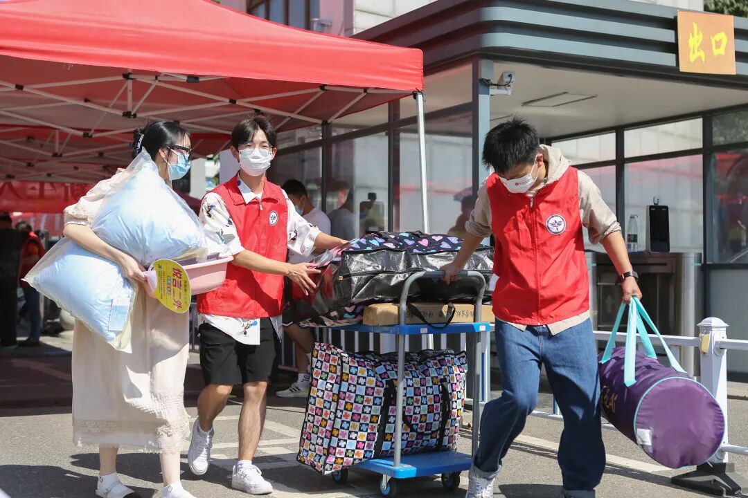 今年的新生报到与往年略有不同,由于疫情防控,家长们无法同新生一起进校,学校为此安排了专门的摆渡车和志愿者,帮助新生顺利入学。