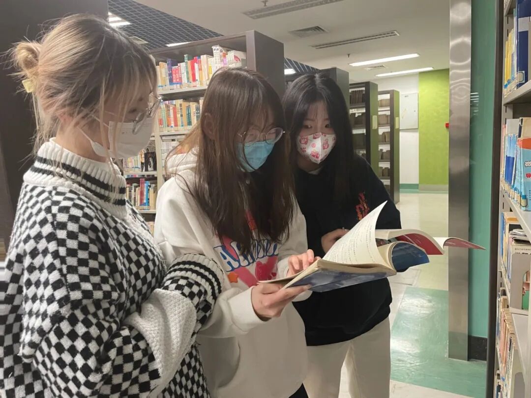 “明天没课,一起去图书馆。”