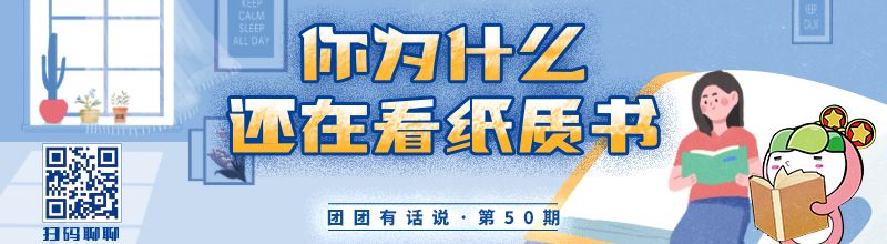 【你为什么还在看纸质书】你平时都是通过什么方式阅读的呢?你对电子阅读有什么看法呢?你还会去书店吗?还会看、会买纸质书吗?对于纸质书“死”了的说法,你同意吗?你最喜欢的一本书又是什么呢?为什么会喜欢呢?你有什么特别的阅读记忆或故事吗?扫描图中的二维码,把你的观点和想法说给团团听听吧,多长都没关系(最好长一点),团团会从中选取有意义的评论上榜共青团中央微信公众号哦。