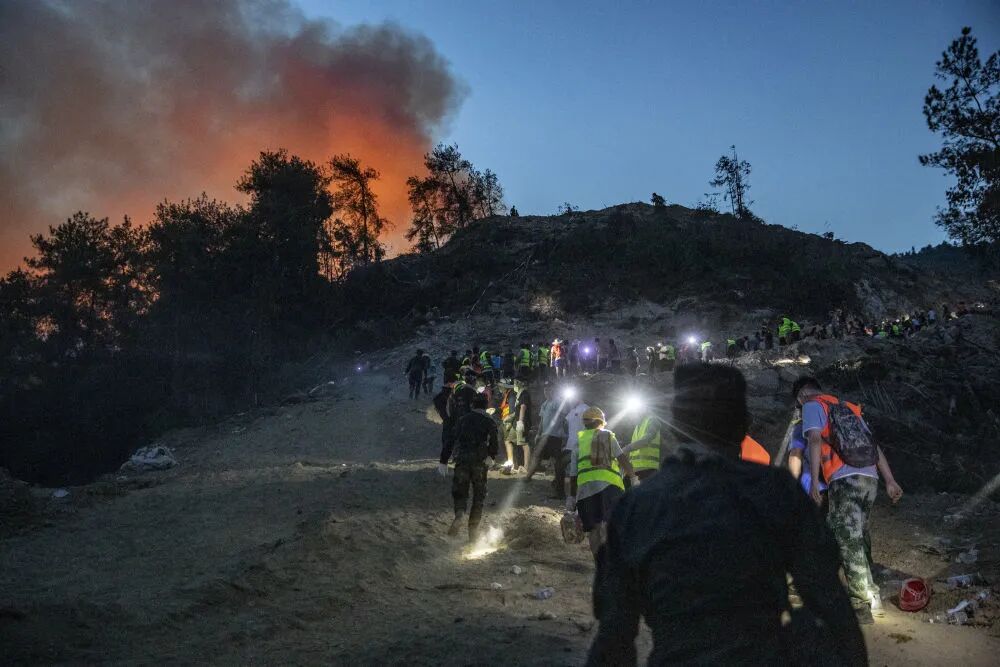 8月25日晚,在山顶隔离带,救援人员和志愿者严阵以待。新华社记者 王全超 摄