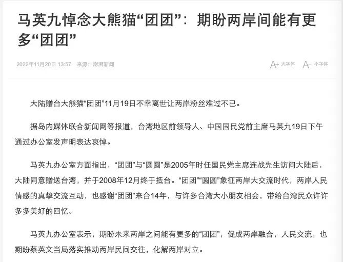 “团团一生,见证两岸关系”,台湾《联合报》11月20日一篇评论称,“团团”“圆圆”不仅带来可观的观光、经济效益,还变成孩子心中的大明星、两岸和平的使者。