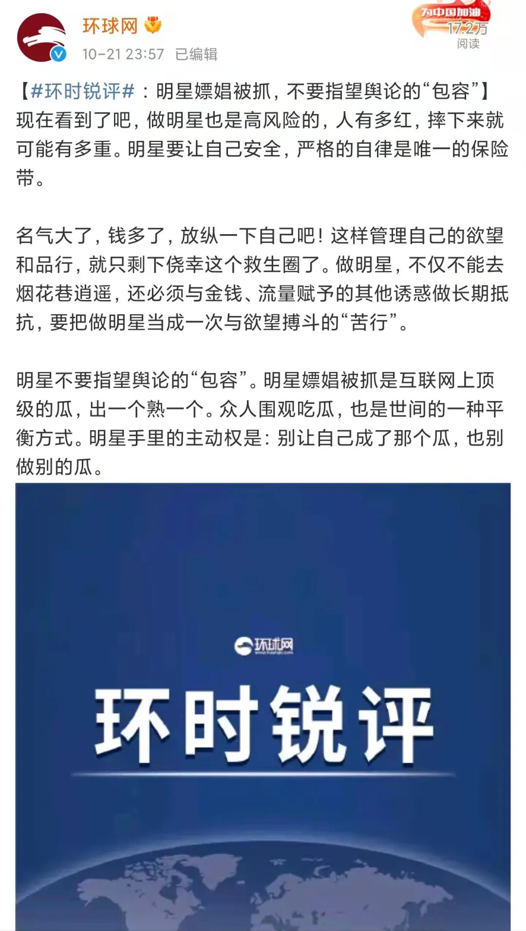 环球锐评:明星嫖娼被抓,