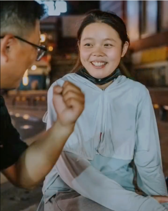 视频场景随后一转,到了一个晚间的操场边。看上去是小陈白天忙着跑单去了,而博主还有很多想和她聊的,于是又约了见面。