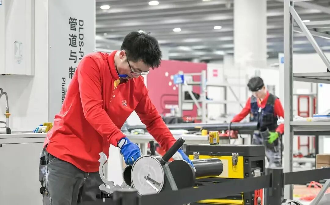 陈宇航(中)在全国首届职业技能大赛的“管道与制暖项目”中摘得金牌。