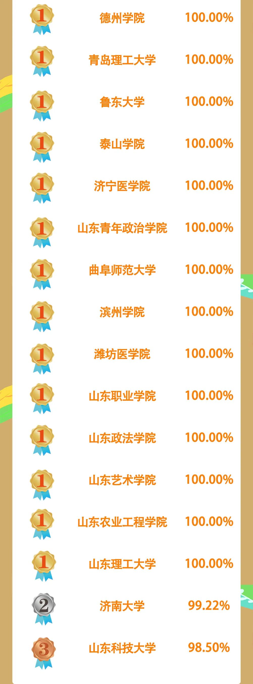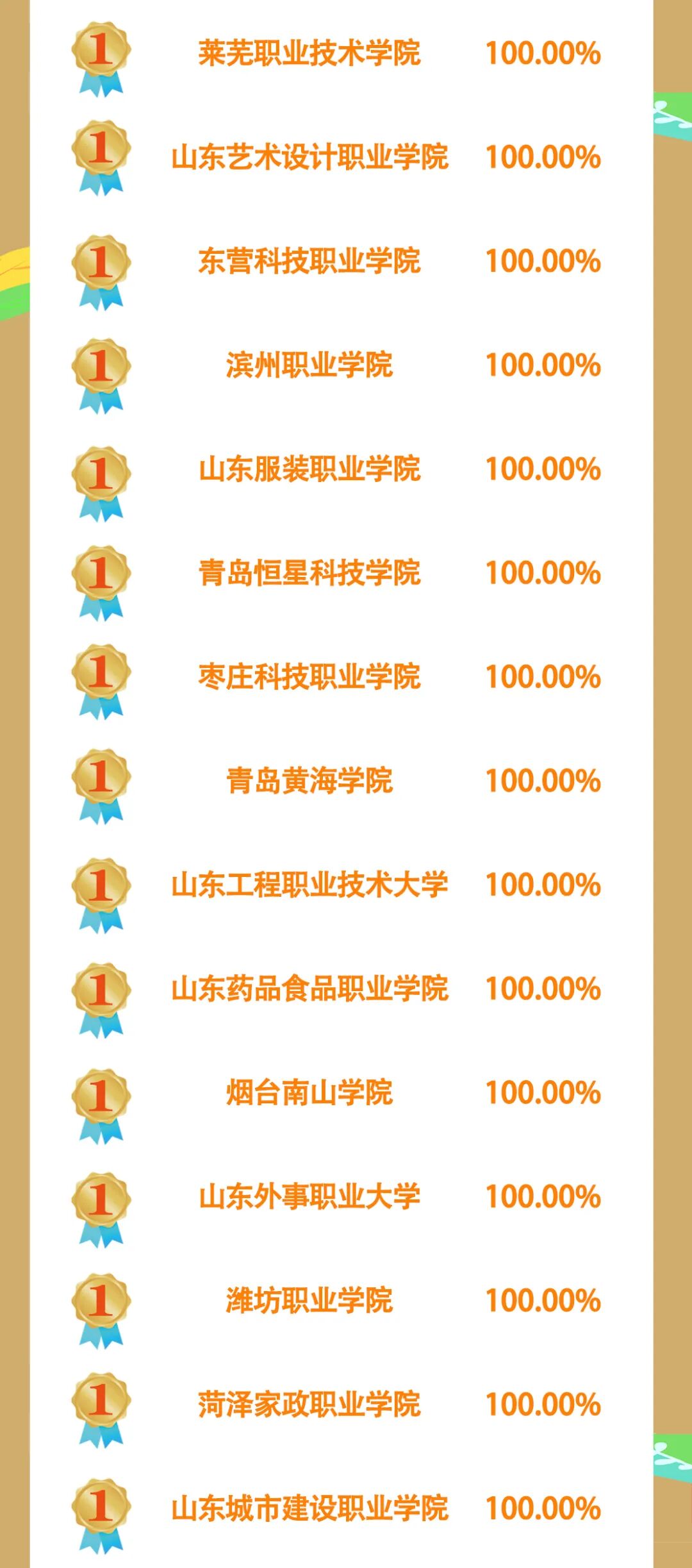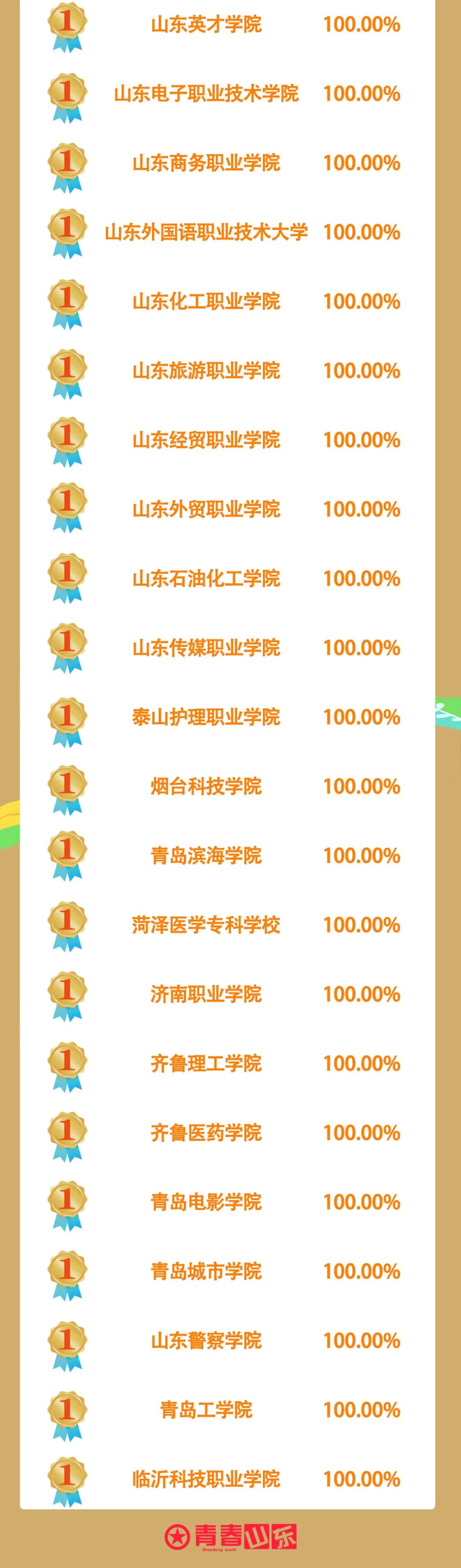 省属高校中,参学率达100%的学校有27所。山东商业职业技术学院获得冠军,聊城大学、山东工艺美术学院位列第二、第三。