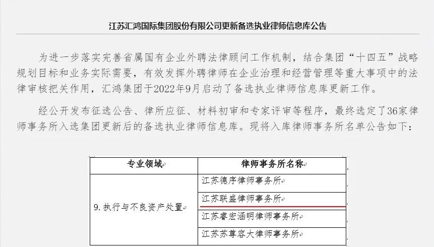 江苏汇鸿国际集团股份有限公司更新备选执业律师信息库公告
