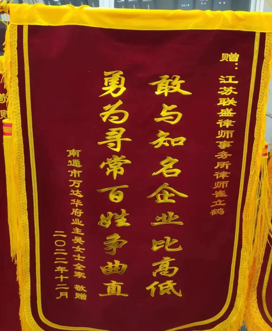 “敢与知名企业比高低,勇为寻常百姓争曲直”,锦旗上金灿灿的这两句话,正是崔立鹤律师这两年来办理吴女士案的工作写照,崔律师做事一贯认真负责,秉承“一份信任,十分努力”的办案风格,受到当事人的好评,这是她今年收到的第三面锦旗。