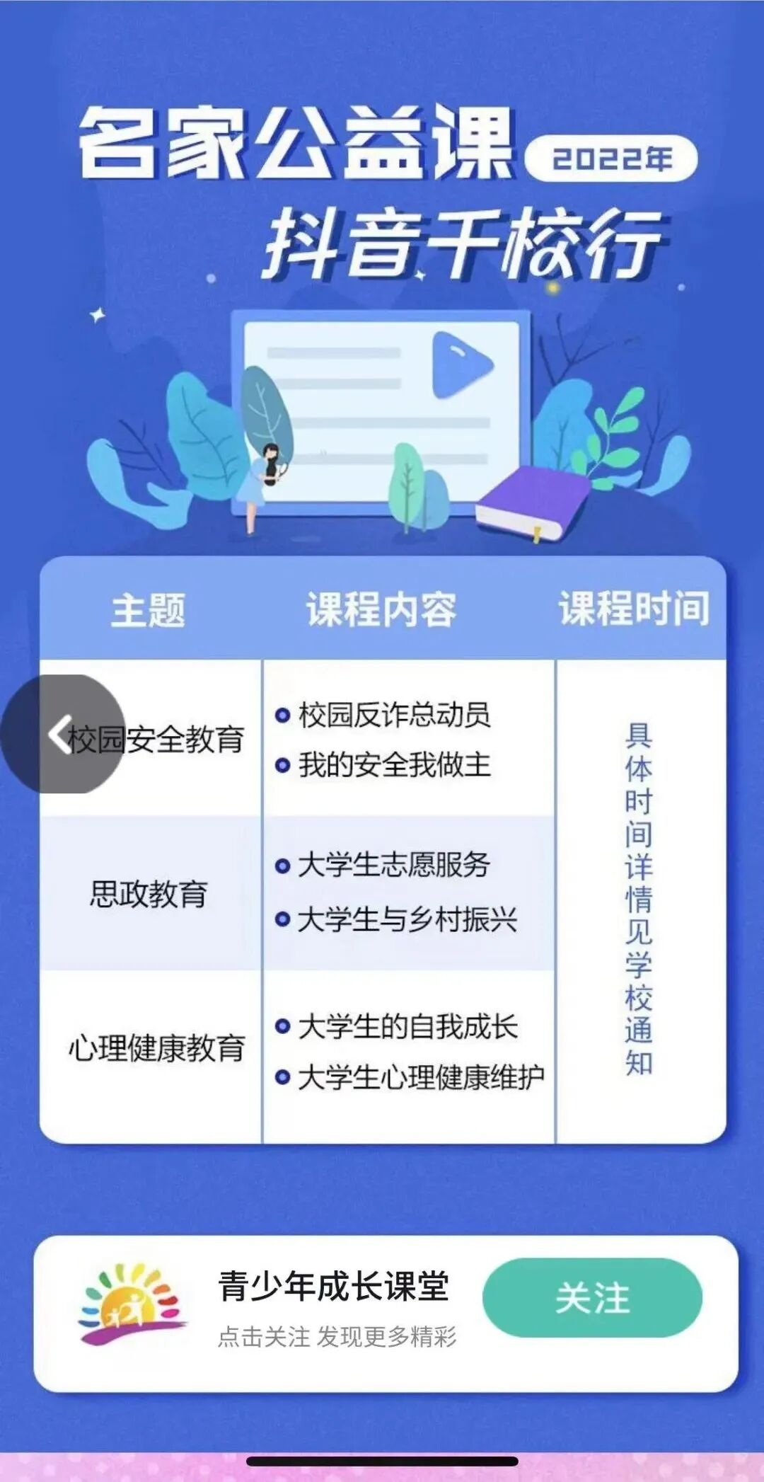 为响应教育部、中央宣传部、中央网信办等十部门发布的《全面推进“大思政课”建设的工作方案》和教育部思想政治工作司《关于组织开展2022年全民国家安全教育日宣传教育活动的通知》等政策性文件号召,公益直播进校园活动计划在各高校开展《思政教育》《大学生心理健康教育》《校园安全》三大主题课程学习。公益课程将邀请中国科学院心理研究所、全国青年志愿服务讲师团等全国知名权威专家,为高校提升大学生综合素养以及疫情反复下开展第二课堂提供优质课程赋能。