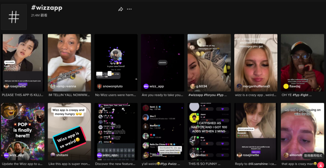 而以#Wizz 为话题的视频在 TikTok 上累计获得了 2.1 亿次播放、以 #Wizzapp 为话题的视频也获得了2400 万次播放,其中大多数视频由 TikTok 上的中小量级 Influencer 或者普通用户发布,发布内容多为自己在 Wizz 上滑到的高颜值用户或者有趣对象,也有用户分享出自己与Wizz上用户的聊天内容。也有用户吐槽自己是如何回怼遇到的那些不礼貌的用户,也获得了不错的关注度。