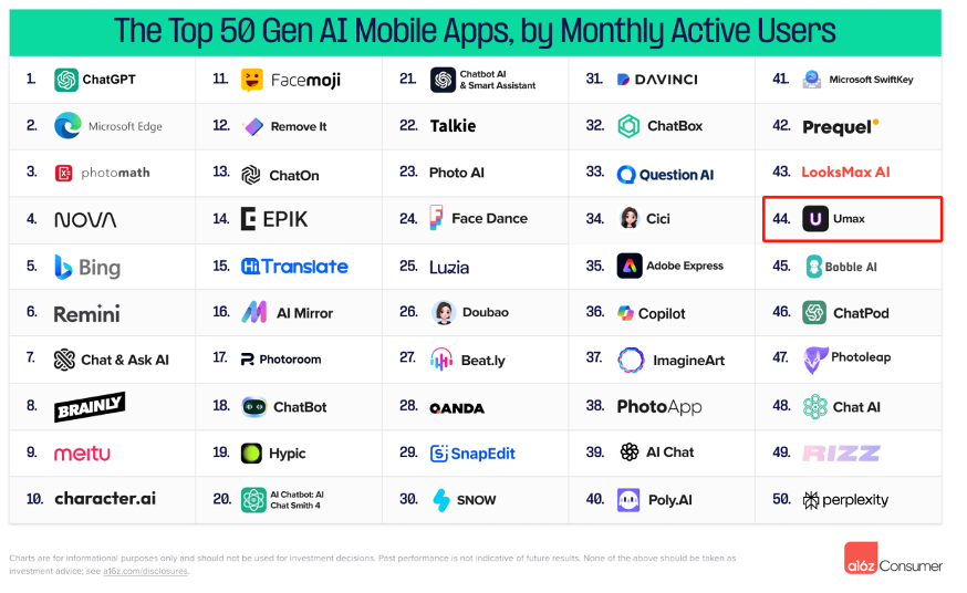 Blake 刚大学毕业不久,因为不想走寻常的上班赚钱养家路径,在一年前开始自己跟着 AI 学编程,而就是这样一个之前并不懂代码的人,靠着 ChatGPT,做了 2 款百万美元 ARR 的 App,第一款是 RizzGPT,后面改名 PlugAI。第二款大家会更熟悉一些,a16z 在 2024 年 8 月份最新发布的 Top50 GenAI App(按 MAU 计)榜单中,位列第 44 的 Umax。
