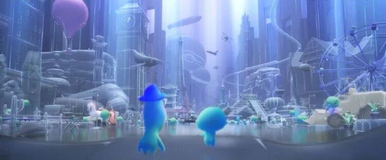 《心灵奇旅》截图:电影中的玄幻世界「生之来处」,和其中的22(主角名字), Joe Gardner 和顾问们。