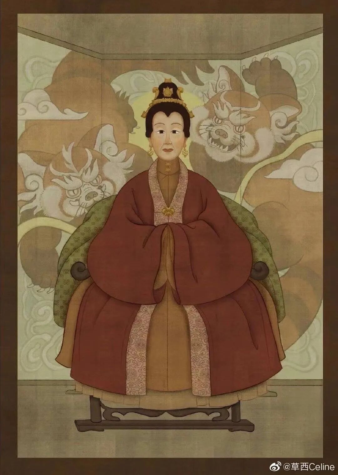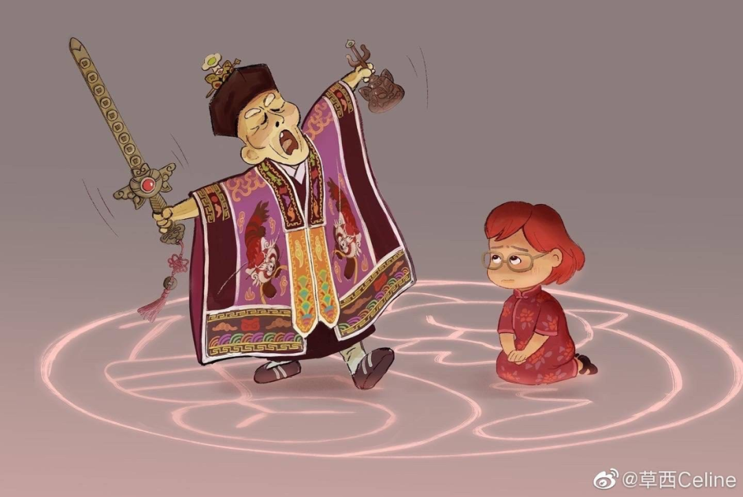 Q2:与皮克斯以往的电影不同,《青春变形记》的主创团队几乎都是女性,在这个团队中工作有没有什么不一样的感觉?游茜:我在皮克斯参与的第一部片是《玩具总动员4》,因为是老牌IP,开会的时候经常是和一屋子中年白人男性一起,到这一部,屋子里站满了女主创,直观的对比感受还是很强烈的,心理上感觉更轻松亲切。Q3:在您看来石之予是一位怎样的导演?和您之前合作的导演相比,她有什么独特之处吗?游茜:石之予导演性格腼腆谦逊,但创意上的脑洞特别狂放。她有自己独到的幽默感和讲故事的方式,对情绪的把控准确又不落俗套,我个人认为是年轻导演梯队里的最强者。她的独特之处是非常知道自己要什么,并能迅速让团队理解到,做决定果断,基本上就是各部门最喜欢的那种省事儿导演吧。Q4.动画中的中国文化元素在网上广受好评,尤其是女主角小美的祖先新怡这个角色,她所穿的明朝服装甚至特意复原了当时女性的头饰狄髻,您当时是如何设计出这个角色的呢?游茜:我当时分析,新怡的设定是明朝人,所以要设计一套明制汉服。当时能拥有容像的女性,所属社会阶层肯定比较高,所以我研究了不同社会阶层的汉服制式,参考了大量明代先祖容像画,最后发现狄髻、头面、裙袄加披风的造型是比较合适她的。同时她的故事又与小熊猫紧密相连,所以我在首饰、衣纹和屏风上都加入了小熊猫图案的设计。其实我根据明朝前中后期的服饰变化,设计了好几版,导演选中了这版,也是我最喜欢的。Q5.您负责了该动画的中国文化研究工作,并且制作了讲述小美家族故事的卷轴动画、小美家祠堂的布景工作,等等。您是怎样进行文化考据的?其中最让您感到印象深刻的部分是?