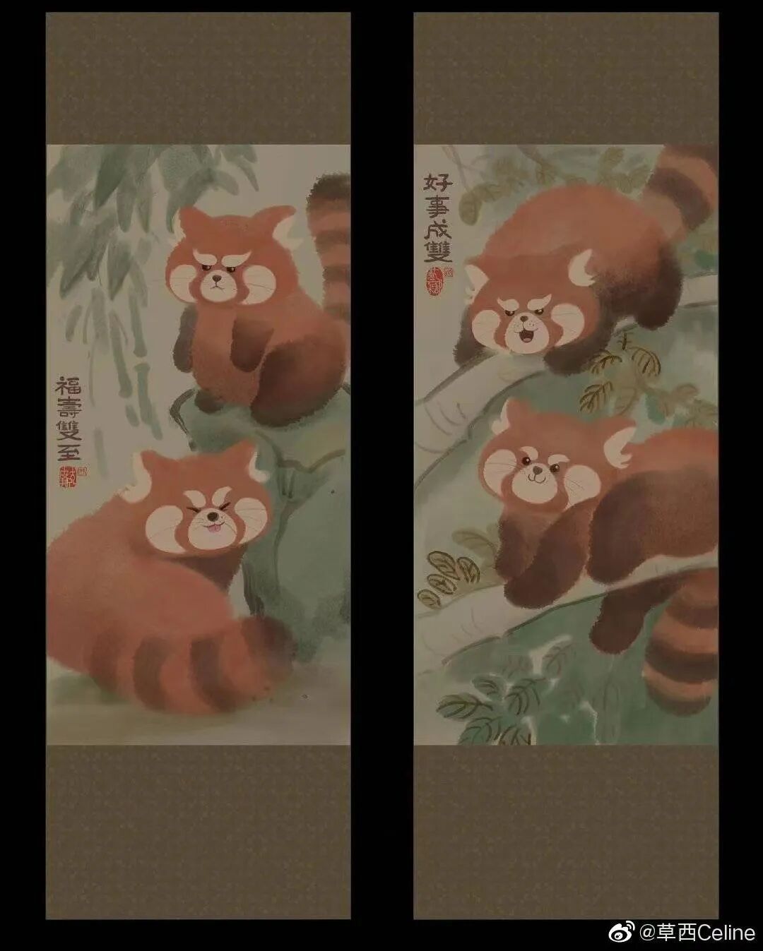 游茜:我希望尽可能准确。比如画卷轴的时候,我研究了明代国画的颜色和笔法,甚至真实发生过的战争,以及双方的服饰、建筑区别。祠堂的布景主要想体现它是一座存在于多伦多闹市的家族祠堂,这与国内的宗族祠堂在细节上会有不同,加入一些不那么“正宗”的西方细节反而更贴切。为此我搜集了很多海外祠堂照片,并把细节运用进来。印象深刻的是中国纹样很有讲究,每个图案都有寓意,比如蝙蝠代表多福,石榴代表多子,一个如意纹画得不对,西方人看不出来,但文化属地的观众是能感受到不对劲的,所以不能敷衍。Q6.《青春变形记》的配色在我看来整体上非常有“少女感”,而随着角色情绪的改变,相应的氛围也会改变。您负责了绝大部分场景的色指定和材质设计,本片在配色和材质选择上有怎样的考量?您是如何与导演以及中期制作部门进行沟通的呢?游茜:这部片青春明快,情绪浓烈,视觉上我们想找到一种风格能最好地传达这种感觉。童年看过的一些2D动画比如《美少女战士》是最大的灵感来源。导演本人超爱90年代的动画,所以沟通很顺畅。配色根据不同场景要搭配主次色调,并且为故事服务。比如美美的房间主色调是和妈妈衣服相似的绿色,但我在她床头的壁纸上设计了大红色的花纹,暗示她在妈妈的掌控下,反叛的自我也在生长。(见下图)材质我们想避免单调,避免极度逼真,追求手工陶器那种温润又有层次的质感。比如很多时候技术部门会渲染出来非常逼真的金属高光,我就会在渲染图上重画,然后跟他们沟通,重渲成更简洁和风格化的高光。游茜:我自己做的吗?可能是那段2D卷轴动画。因为过程非常特殊,当时我刚生完宝宝一个多月,并且已经不再皮克斯工作了,但他们联系我希望再合作这个卷轴,我也很喜欢让水墨画动起来这个想法,就同意了。当时疫情期间,我和先生没有帮手,一边照顾新生儿,一边工作非常辛苦。但看到成品还是觉得很开心的!Q8.制作这部电影时,全球正处于疫情肆虐的状态,在整部作品的制作过程中,有多少内容是你们在家办公完成的?皮克斯是如何协调团队在家进行协作的?游茜:大部分中期制作都是在家完成的。当时我们把电脑、绘画屏搬回了家中,公司也可以邮寄一切所需办公物品。技术团队随时待命,有问题就会远程连线帮我们解决,为此我还画过下面这张小卡片感谢他们。