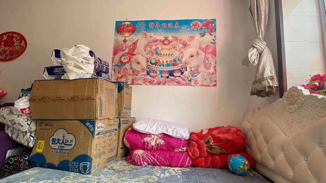 ●宋青芸家中一角,堆放着孩子的大量纸尿裤。魏芙蓉摄。