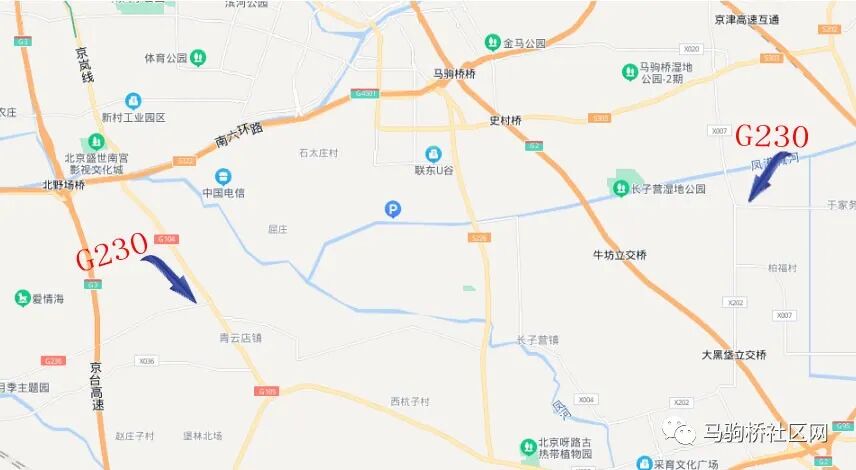 从2021年的一张规划图中可以看出,拟建设国道230将由马驹桥九周路交叉路口向北修建,穿过马驹桥大松垡村、长子营镇牛坊村向西修建。现在的G230国道,中间的马驹桥到青云店段还都未修建。
