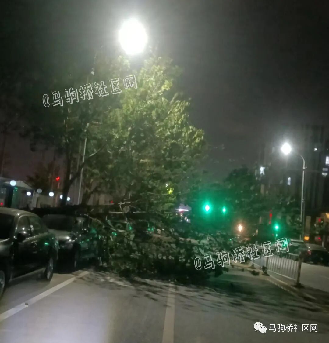 昨天晚上,马桥一位网友在回家的路上发现,物流基地IN北京小区东侧马路的一棵树被刮倒了。刮倒的树占据了半条马路,把北向南的路都给堵上了。停在路边的一辆私家车遭了殃,正好被树砸个正着。