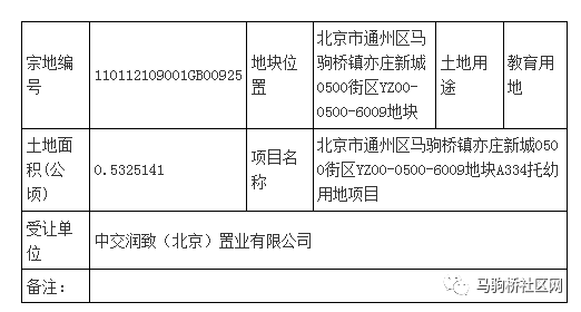 根据公示信息显示,该地块的土地面积为0.5325141公顷(5325.141 平方米),项目名称为北京市通州区马驹桥镇亦庄新城0500街区YZ00-0500-6009地块A334托幼用地项目,受让单位为中交润致(北京)置业有限公司。