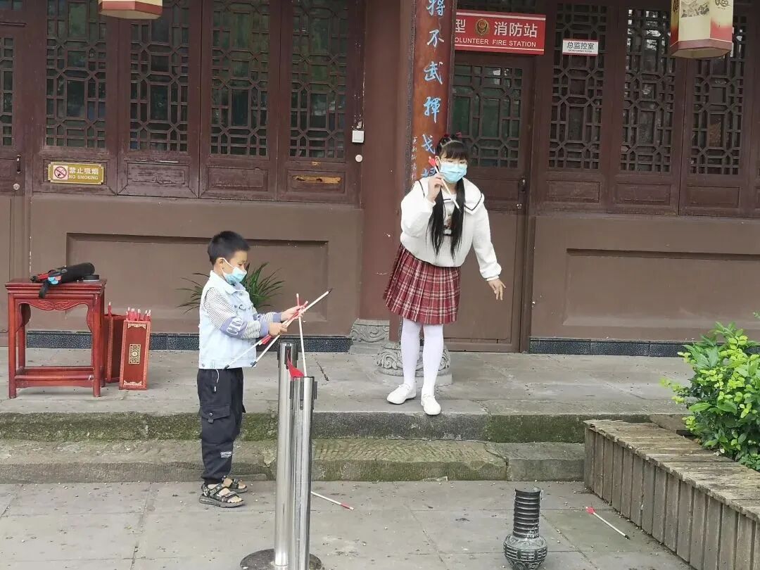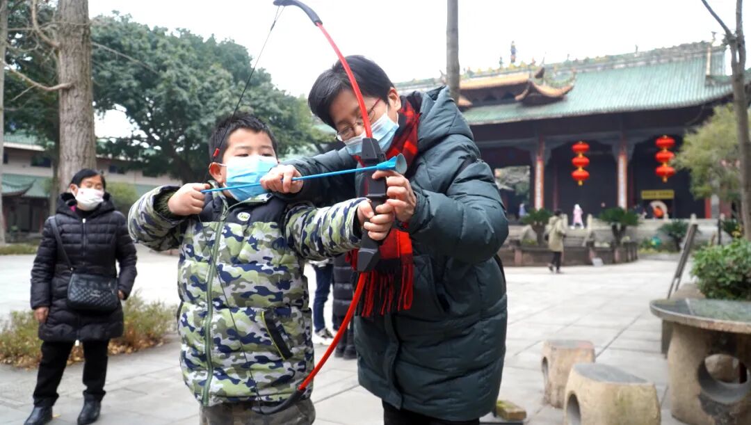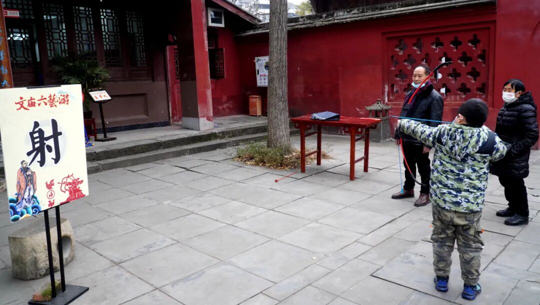 “它指‘礼’‘乐’‘射’‘御’‘书’‘数’,是孔子教学的主要科目。‘六艺’蕴含着我们古人对于天地万物的追求以及德才兼备的向往,潜移默化间,它早已浸润在我们的日常生活中。‘六艺’开始于公元前1046年的周王朝,是中国周朝的贵族教育体系,贯穿于我们华夏五千年的文明……”犍为文庙解说员陈怡希说,平常游客到犍为文庙都是参观或者是听讲解,今年春节,犍为文庙特意举行“六艺游”活动,其目的是让游客能亲身体验儒家文化,从而传承儒家文化。