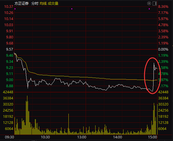 4月30日方正证券股价持续下跌,一度跌逾8%,随后尾盘出现异动,在最后10分钟内直线拉升,跌幅收窄,最终收跌3.76%,收盘价9.21元。