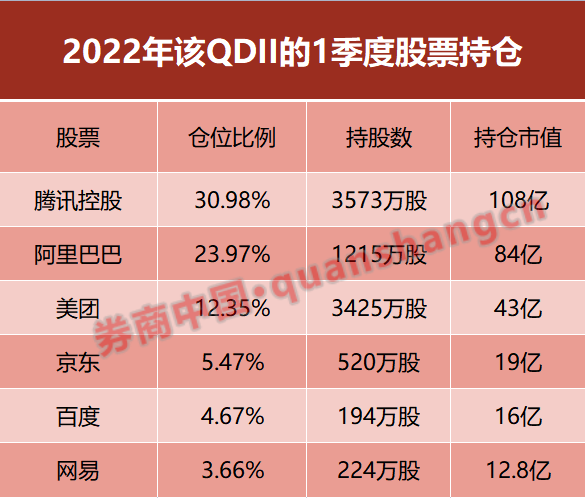 那么该指数QDII基金的第二大重仓股是什么呢?该基金披露投入超过70亿人民币重仓阿里巴巴,阿里巴巴股票占该基金资产净值比例达到21.46%。第三大重仓股是美团,基金经理截至去年末投入了48亿资金,美团股票占这只QDII资产净值比例达到14.72%。