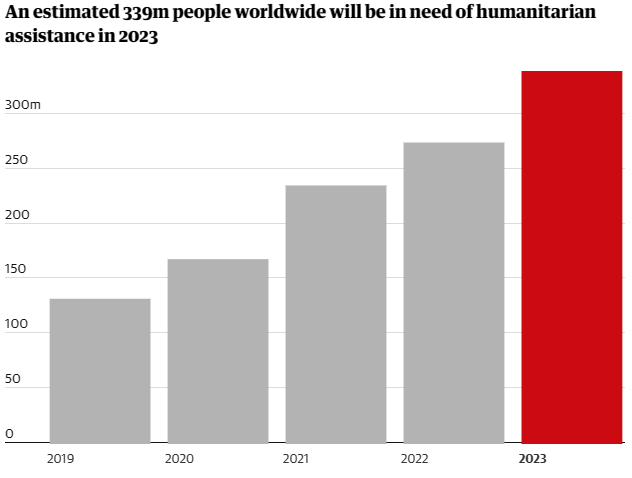 这番警告出自于联合国负责人道主义事务副秘书长兼紧急救济协调员Martin Griffiths提交的《联合国2023年全球人道主义概述》。其中指出,由于2022年的一系列“极端事件”,2023年将有3.39亿人需要救济,比今年增加6500万人,并将创下历史纪录。
