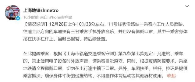 据@上海地铁 ,12月28日上午10时38分左右,11号线秀沿路站一乘客向工作人员反映,往迪士尼方向的车厢里有三名乘客手机外放音乐,并且没有佩戴口罩,其中一乘客身体吊在扶手栏杆上。当时已报警,待后续处置。