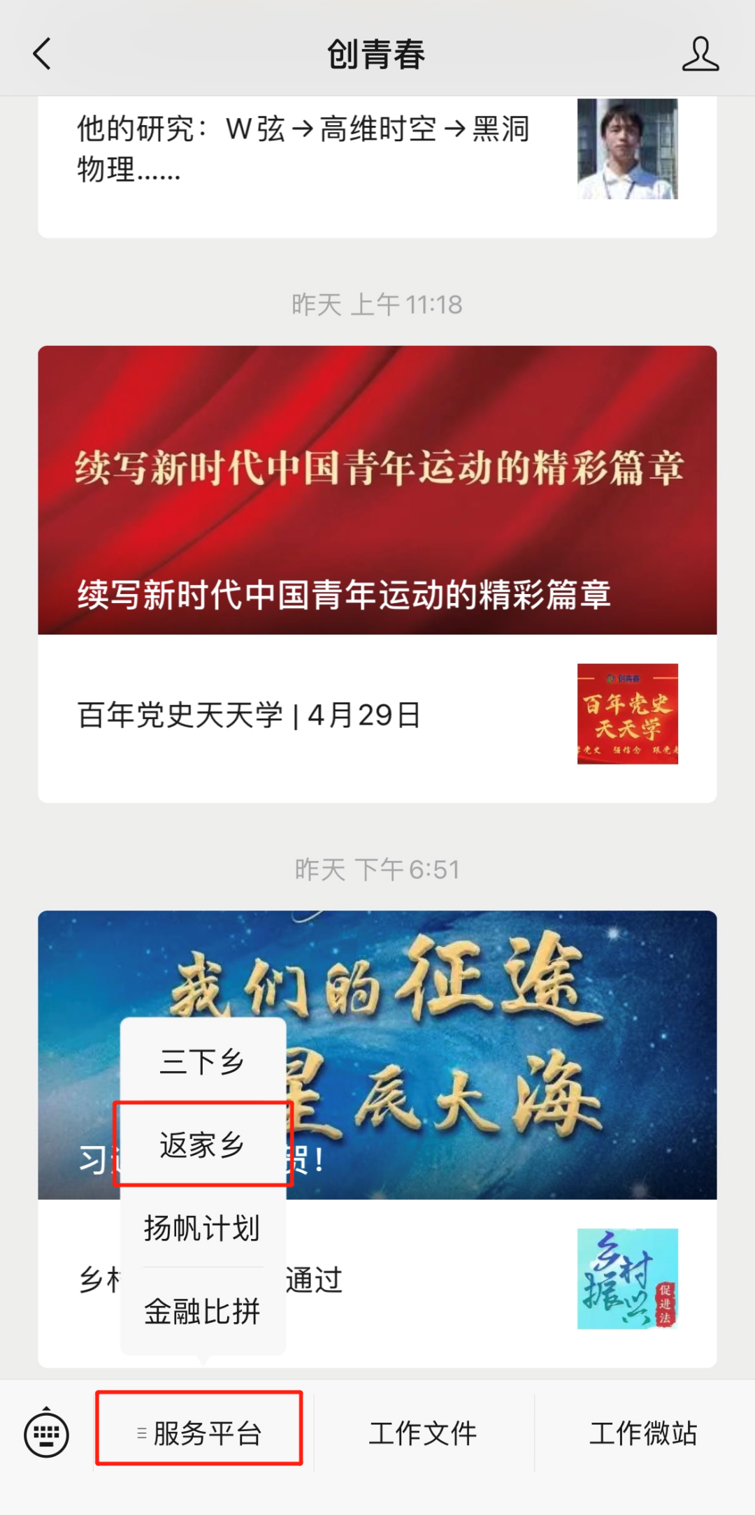 1.关注“创青春”公众号,选择"服务平台"-“返家乡”栏目;
