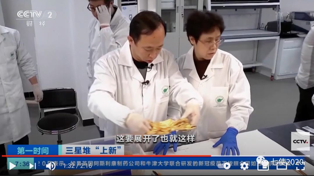 虽然折叠了好几重,但表面的泥土非常松软。专家煞有介事拿个镊子掏来挖去,实际上那些泥土松软得随便一个毛刷子都能扫干净。一点不像埋在地里三千多年的样子。