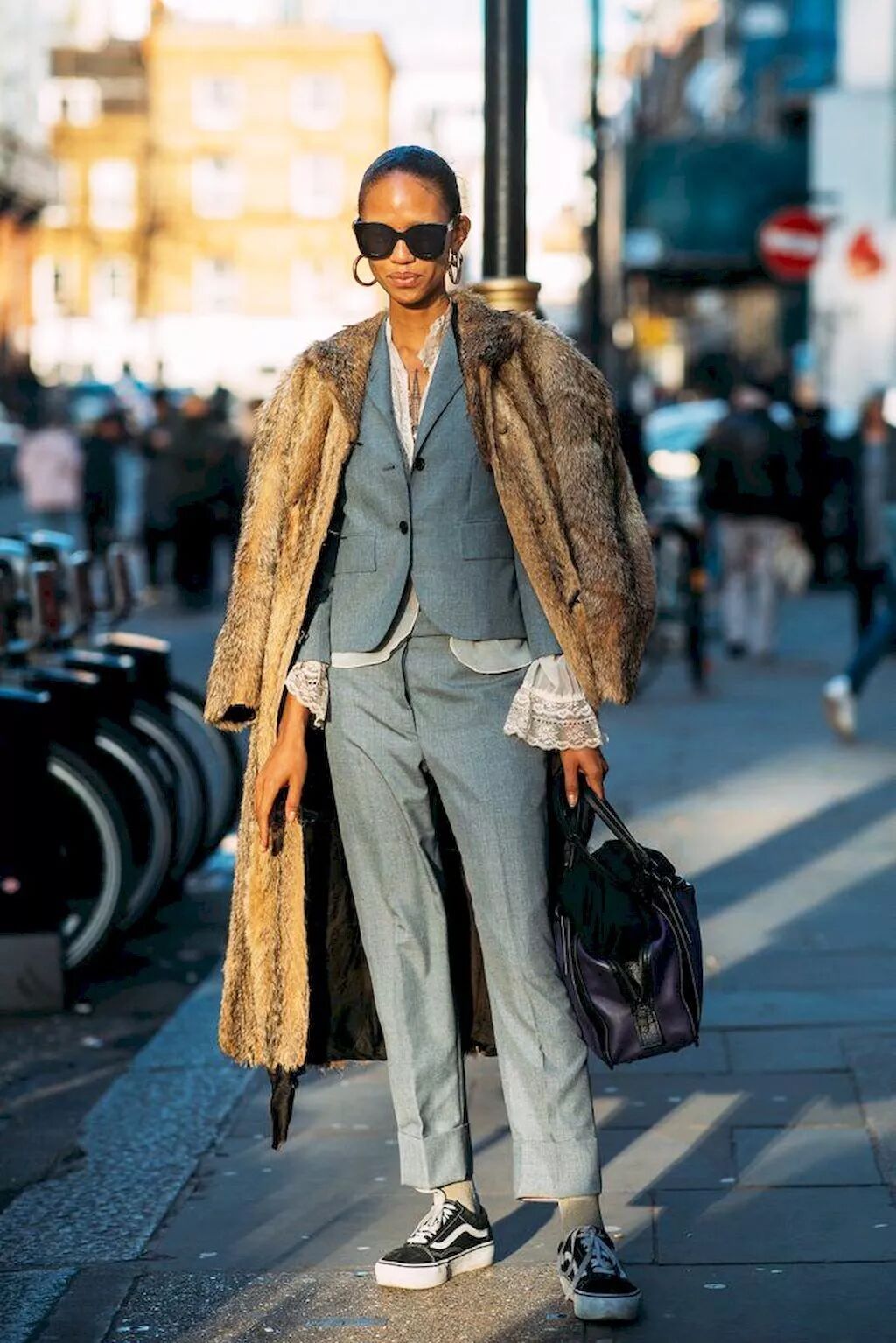 A:这件毛毛装饰大衣是我最爱的单品之一。平绒面料保暖又不会在冬季干燥的环境下产生静电,也不容易留下褶皱。袖口黑银色毛毛是人造仿狐狸毛,保证了有质感又很环保。