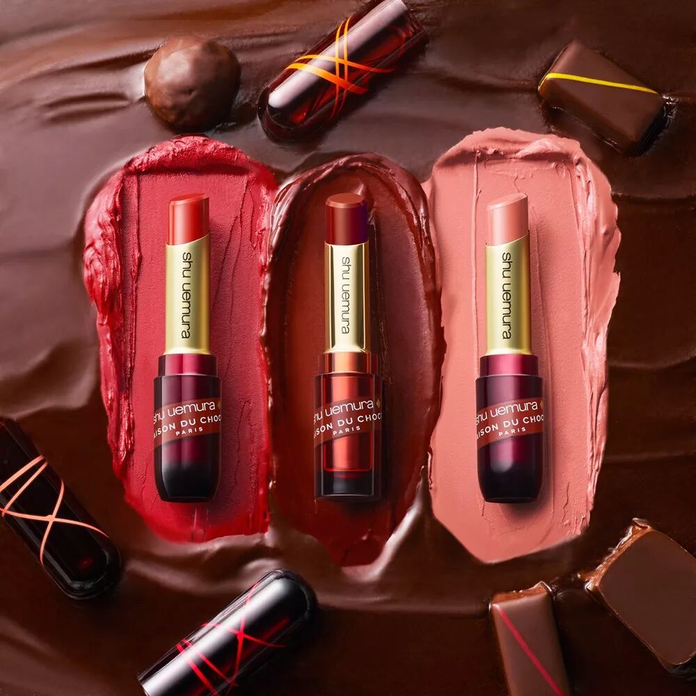 shu uemura跨界联手法国巧克力品牌LA MAISON DU CHOCOLAT,大玩食色诱惑!当彩妆具有巧克力的迷人香气,每一次启唇都成为“色诱”。