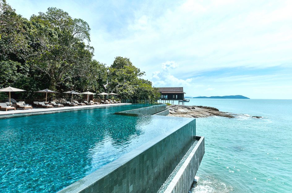 在兰卡威丽思卡尔顿酒店的Horizon休闲无边泳池中仿佛与天地融为一体。