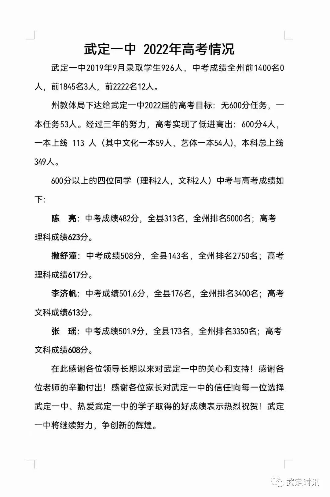 楚雄福泉中学2022年高考成绩汇报(一)