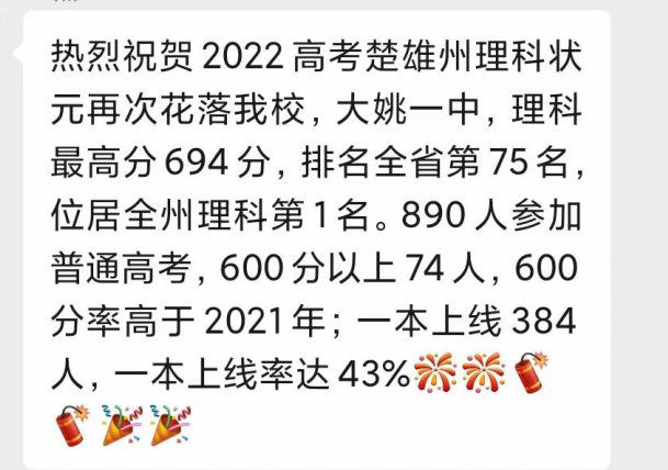 大姚一中600分以上74人,600分率高于2021年;全州理科状元694分花落大姚一中。一本上线384人,一本上线率达43%。