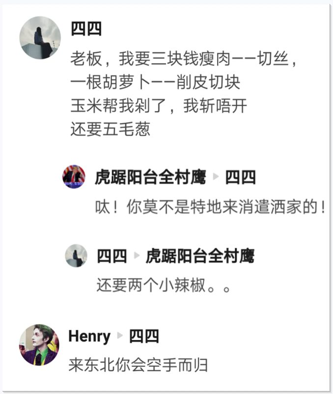 如果是在北方,那可能就要改成“请搂点猪肘子”“端上来铁锅炖大鹅”“再塞个烙饼卷带鱼”了。