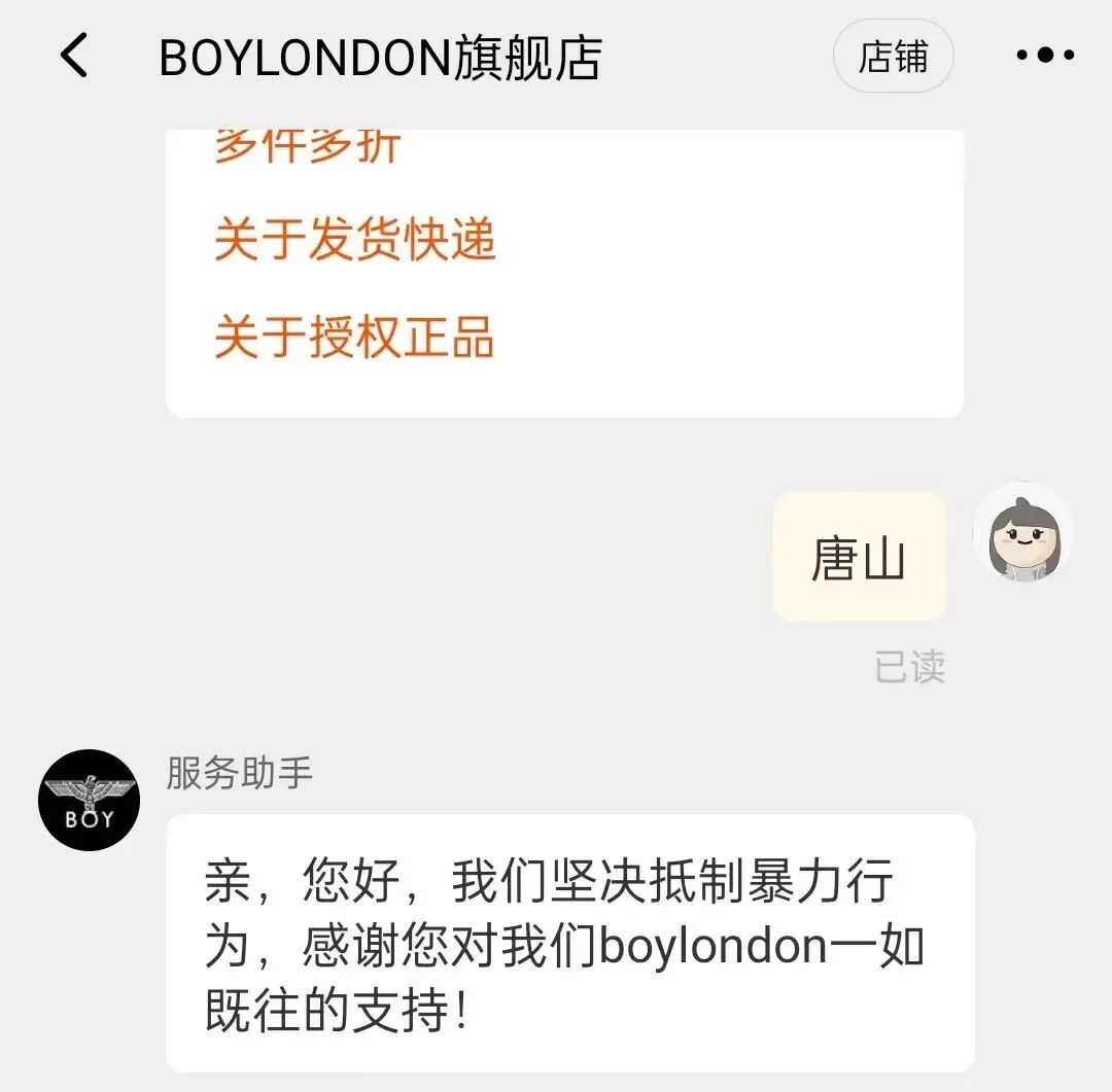 品牌的官方社交平台评论区,密密麻麻挤满了网曝的言论。迫于压力,BOY LONDON在其天猫旗舰店的客服对话中设置了自动回复,甭管你问什么,都得以“我们坚决抵制暴力行为”开头。