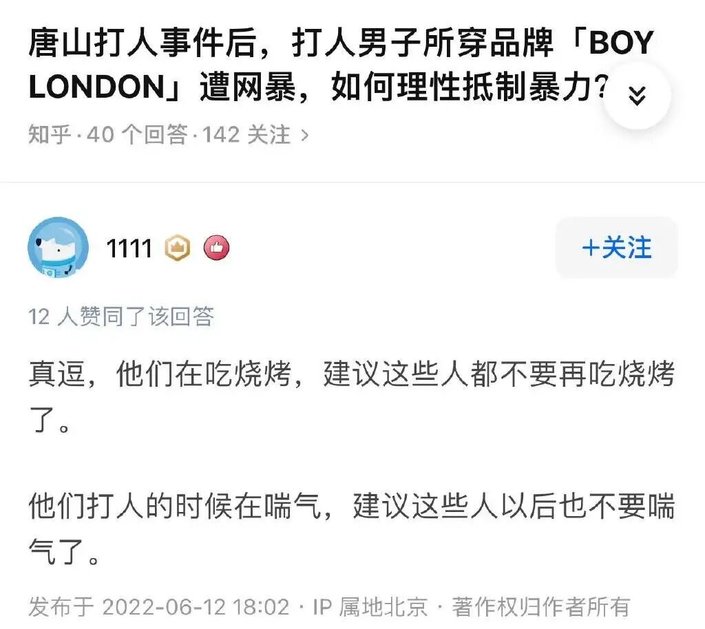 网友们无处安放的怒火瞬间就被点燃,有人能爱屋及乌,就有人会恶其余胥、殃及池鱼,BOY LONDON被网友封为了“唐山烧烤战衣”,逻辑简单粗暴:坏人穿的衣服,一定不是什么好衣服。