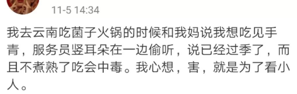 需要严肃提醒的是,中毒听起来奇妙,后果却很可怕,严重者可能连这个美丽的世界都见不到了。在云南饭馆吃菌子火锅,煮熟之前店家根本不给上筷子,就怕没耐心的顾客从火锅里偷吃。