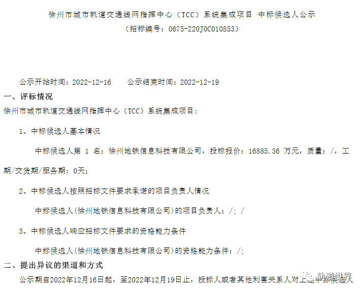 徐州市城市轨道交通线网指挥中心(TCC)系统集成项目中标结果