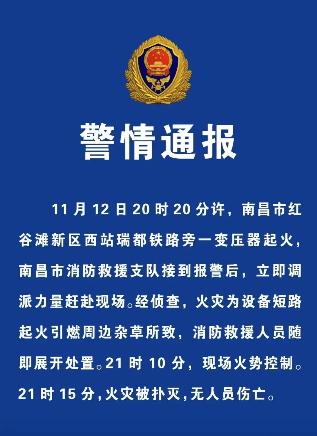 据南昌铁路发布消息,12日晚8时许南昌市红谷滩区一铁路变电所出现火情,造成铁路接触网跳闸停电。受此影响,途经南昌西站的部分旅客列车出现晚点。目前,现场明火已扑灭,无人员伤亡。