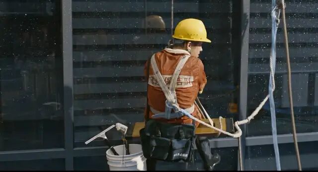 少数展现高楼大厦的场景,也是用了高空清洁工作者的视角,而非纯粹的展示华丽、昂贵的景致。从这里也可以看出文牧野的人本主义精神,外面是悬挂着的工人,里面是悠然吃着午餐的人,真正缔造这种城市繁荣和靓丽外观的劳动者,反而与它的璀璨毫无关系。