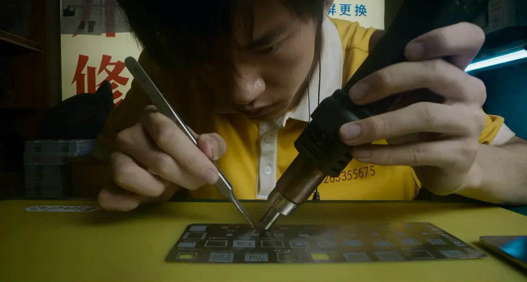 在横轴线上,小小一间手机修理店变成集装箱手机加工工厂,空间随着他的不可能任务而拓展开。但与此同时,为了拓展工作空间,他自身的生存空间开始不断受到压迫。付了工人工钱、集装箱租金,自己反而没办法交房租被赶出门。