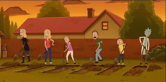 在这集结尾,瑞克掩埋平行宇宙自己的尸体的场景仿佛第一季的情景再现,只是这一次他带上了全家。「我本可以丢下你们,你们觉得『家人』这个概念对我来说重要吗?我可不是你们的莫蒂」我惊讶地发现现在连家中地位最低下的杰瑞都可以吐槽瑞克了:「你是嘴硬的莫蒂。」