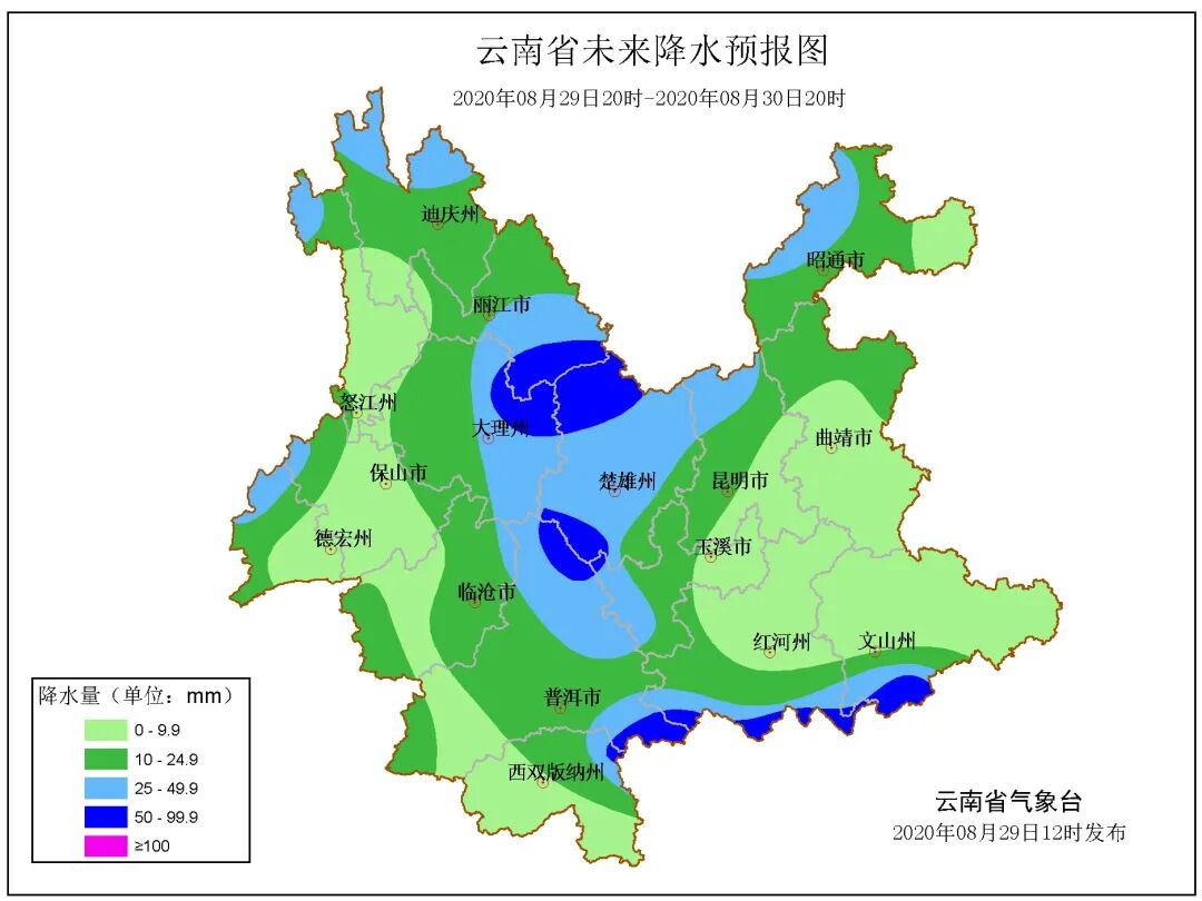 受低涡切变影响,预计8月28日夜间至31日,我省自北向南将出现一次强降水天气过程,其中迪庆、丽江、大理、怒江、楚雄、昆明、昭通北部和西部、曲靖北部、玉溪、文山南部、红河南部、普洱、西双版纳、临沧、保山、德宏有中到大雨局部暴雨、大暴雨,并伴有雷电、局地冰雹、大风等强对流天气。过程期间,曲靖中南部、文山北部、红河北部降水量较小,以小到中雨为主。