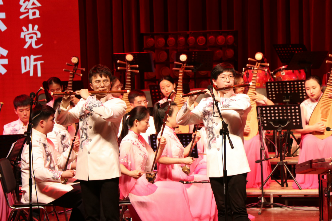 金声玉振,弦歌绕梁。琵琶、唢呐、古筝、扬琴、柳琴、笙箫、二胡、锣鼓、管弦辉映齐鸣:古筝协奏《井冈山》、《山丹丹》展现了井冈山上星星之火、宝塔山下红旗飘扬的革命岁月,笛子与乐队协奏《幽兰逢春》刻画了周恩来总理心忧天下、竭诚为民的公仆情,扬琴独奏《节日的江南》描摹了改革开放的春风吹拂希望田野的精彩图景,笙独奏《阿细欢歌》勾勒了少数民族同胞取得脱贫攻坚全面胜利的动人场面。开天辟地、改天换地、翻天覆地、惊天动地的党史篇章一一奏响,党领导中国人民逢山开路、遇水搭桥、拥抱时代、走向辉煌的脚步愈发清晰。在场观众跟着民乐演奏的旋律轻轻哼唱、拍打节拍,在动人的旋律中感悟党团结带领中国人民创造的历史伟业,在艺术的熏陶里学史明理、学史增信、学史崇德、学史力行。
