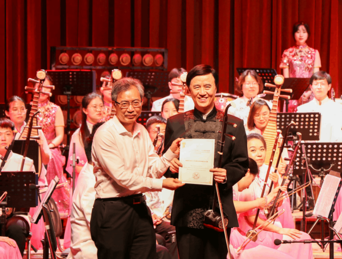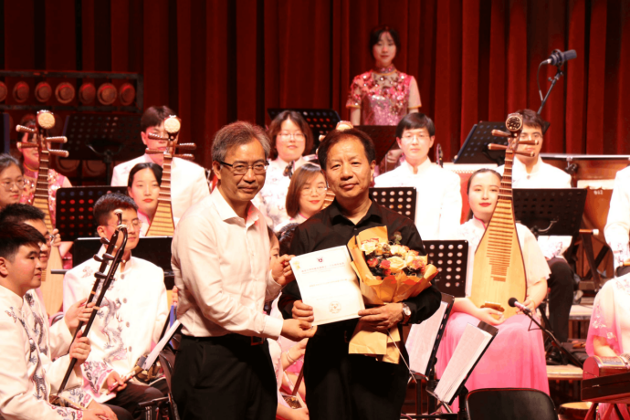 今年恰逢南京大学民乐团成立25周年,演出过程中,谈哲敏常务副校长代表学校向长期以来支持和关心民乐团建设发展的朱昌耀先生、王爱康先生颁发了感谢状。