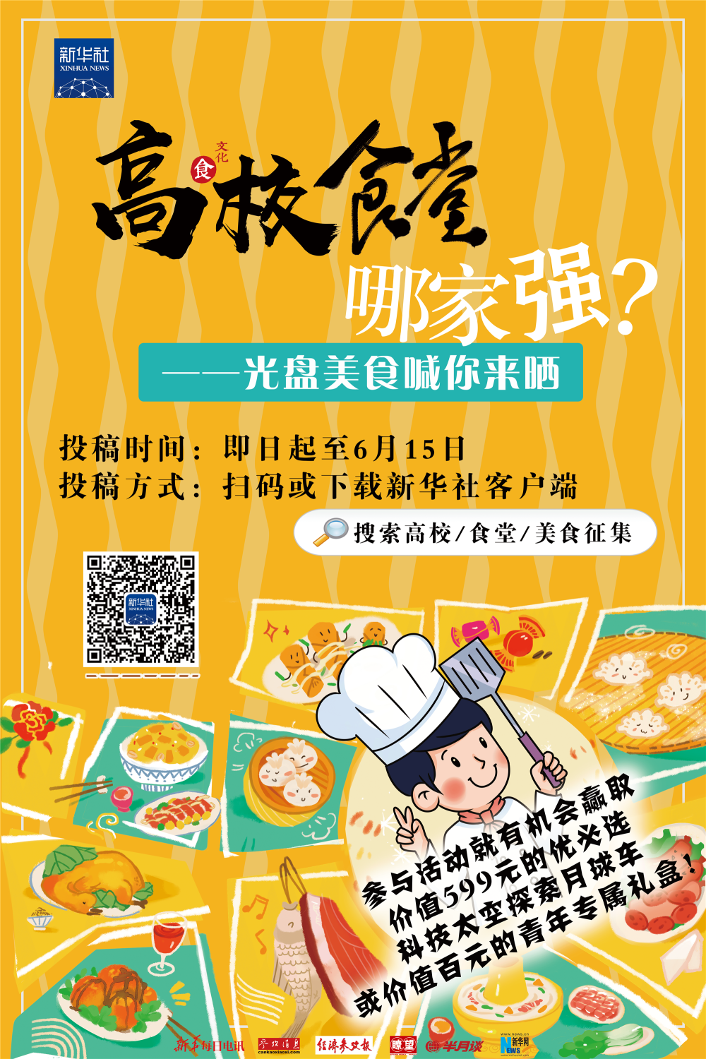 投稿方式:扫描海报二维码或下载新华社客户端搜索“高校/食堂/美食征集”参加活动。