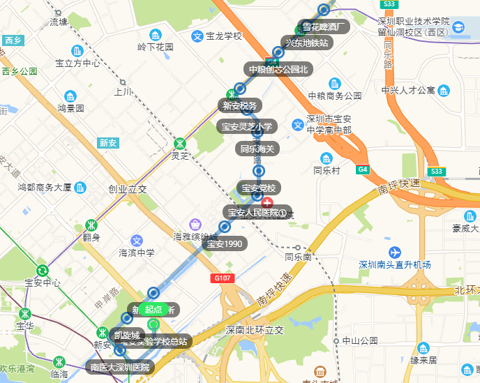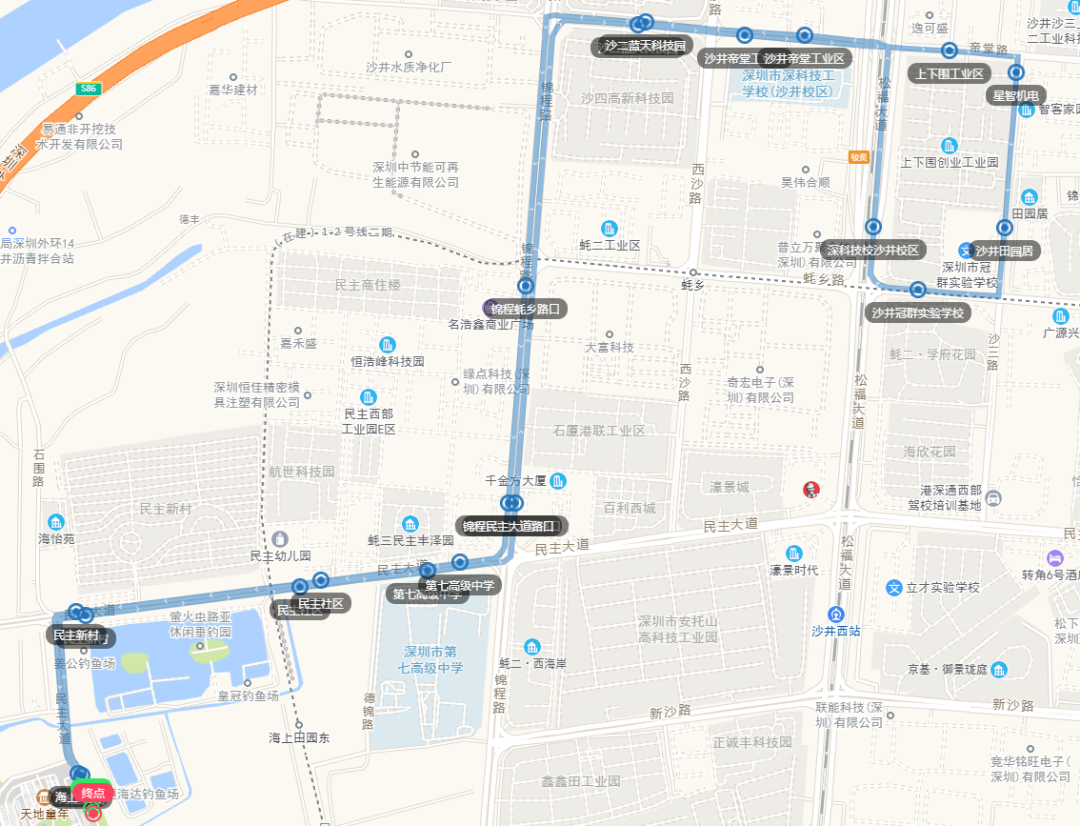 海上田园、民主新村、民主社区、第七高级中学、锦程民主大道路口、沙二蓝天科技园、沙井帝堂工业区、上下围工业区、星智机电、沙井田园居、沙井冠群实验学校、深科技校沙井校区、沙井帝堂工业区、沙二蓝天科技园、锦程蚝乡路口、锦程民主大道路口、第七高级中学、民主社区、民主新村、海上田园